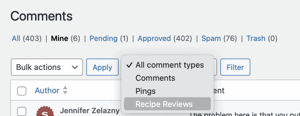 Note – you will need to change out ‘recipe_review’ for whatever you are using. Once you save that, go back to the WP Admin > Comments and you will see your comment type now listed in the “All comment types” dropdown which will allow you to filter only that comment type.
